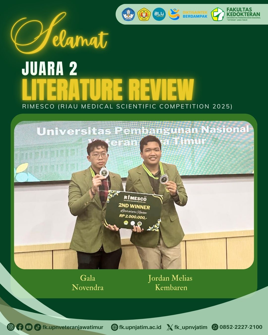 Mahasiswa Fakultas Kedokteran UPN “Veteran” Jawa Timur kembali meraih prestasi pada ajang RIMESCO (RIAU MEDICAL SCIENTIFIC Competition 2025). Tim yang terdiri dari Jordan Melias Kembaren dan Gala Novendra ini tampil sebagai juara kedua pada pengumuman pemenang yang disampaikan tanggal 31 Agustus 2025. RIMESCO sendiri merupakan ajang tahunan yang diselenggarakan Mediscus FK UNRI. Diharapkan keberhasilan ini dapat menjadi motivasi bagi seluruh sivitas akademika Fakultas Kedokteran untuk terus berprestasi baik di bidang akademik maupun non-akademik.