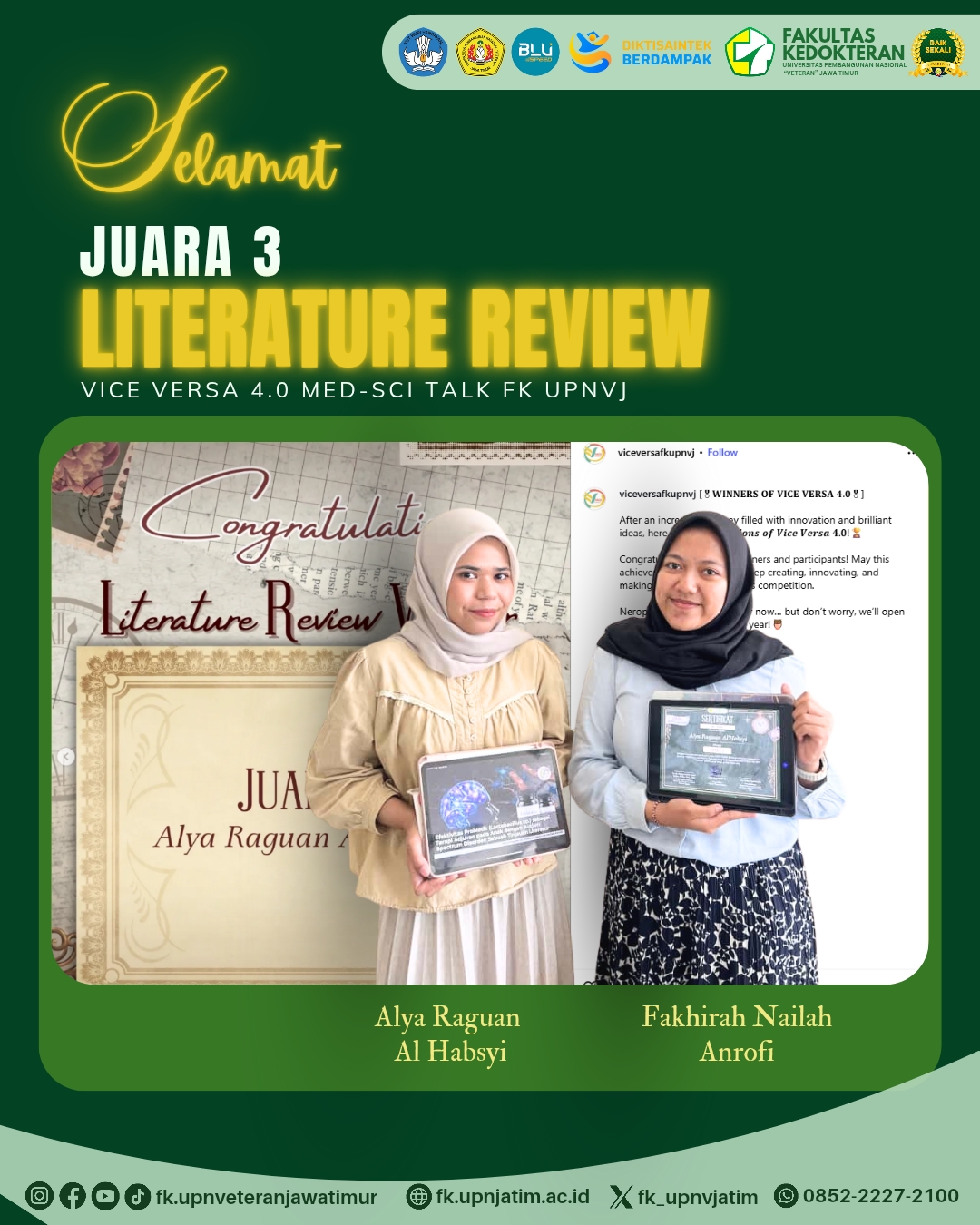 Mahasiswa Fakultas Kedokteran UPN “Veteran” Jawa Timur kembali berprestasi dengan meraih Juara 3 dalam ajang VICE VERSA 4.0 yang diselenggarakan oleh FK UPN ”Veteran” Jakarta. Lomba yang diikuti oleh mahasiswa rumpun kesehatan se-Indonesia ini mengangkat tema ”𝑭𝒐𝒓𝒎𝒖𝒍𝒂𝒕𝒊𝒏𝒈 𝑪𝒐𝒎𝒑𝒓𝒆𝒉𝒆𝒏𝒔𝒊𝒗𝒆 𝑺𝒕𝒓𝒂𝒕𝒆𝒈𝒊𝒆𝒔 𝒊𝒏 𝑨𝒅𝒅𝒓𝒆𝒔𝒔𝒊𝒏𝒈 𝑵𝒆𝒖𝒓𝒐𝒑𝒔𝒚𝒄𝒉𝒊𝒂𝒕𝒓𝒊𝒄 𝑫𝒊𝒔𝒐𝒓𝒅𝒆𝒓𝒔 𝒕𝒐 𝑬𝒏𝒉𝒂𝒏𝒄𝒆 𝑷𝒖𝒃𝒍𝒊𝒄 𝑨𝒘𝒂𝒓𝒆𝒏𝒆𝒔𝒔 𝒂𝒏𝒅 𝑯𝒆𝒂𝒍𝒕𝒉𝒄𝒂𝒓𝒆 𝑹𝒆𝒑𝒐𝒏𝒔𝒆 𝒊𝒏 𝒕𝒉𝒆 𝑬𝒓𝒂 𝒐𝒇 𝑻𝒆𝒄𝒉𝒏𝒐𝒍𝒐𝒈𝒊𝒄𝒂𝒍 𝑻𝒓𝒂𝒏𝒔𝒇𝒐𝒓𝒎𝒂𝒕𝒊𝒐𝒏” dan terbagi ke dalam 3 kategori. Tim yang terdiri dari Alya Raguan Al Habsyi dan Fakhirah Nailah Anrofi akhirnya diumumkan sebagai pemenang ketiga kategori Literature Review melalui instagram resmi VICE VERSA. Diharapkan keberhasilan ini dapat menjadi motivasi bagi seluruh sivitas akademika Fakultas Kedokteran untuk terus berprestasi baik di bidang akademik maupun non-akademik.