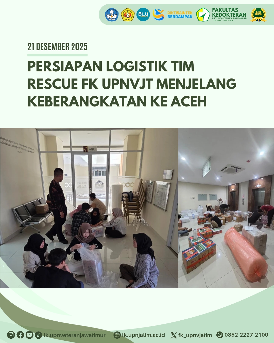 Surabaya – Fakultas Kedokteran Universitas Pembangunan Nasional (UPN) “Veteran” Jawa Timur melaksanakan persiapan logistik pada Minggu, 21 Desember 2025 dalam rangka Program Pengabdian kepada Masyarakat (PkM) tanggap darurat bencana di Aceh. Kegiatan ini mengusung tema “Mengabdi untuk Negeri: Intervensi Pemulihan Kesehatan Pasca Bencana Aceh sebagai Wujud Bela Negara.” sebagai bentuk kepedulian institusi terhadap penanganan bencana dan penguatan kapasitas masyarakat dalam situasi darurat.