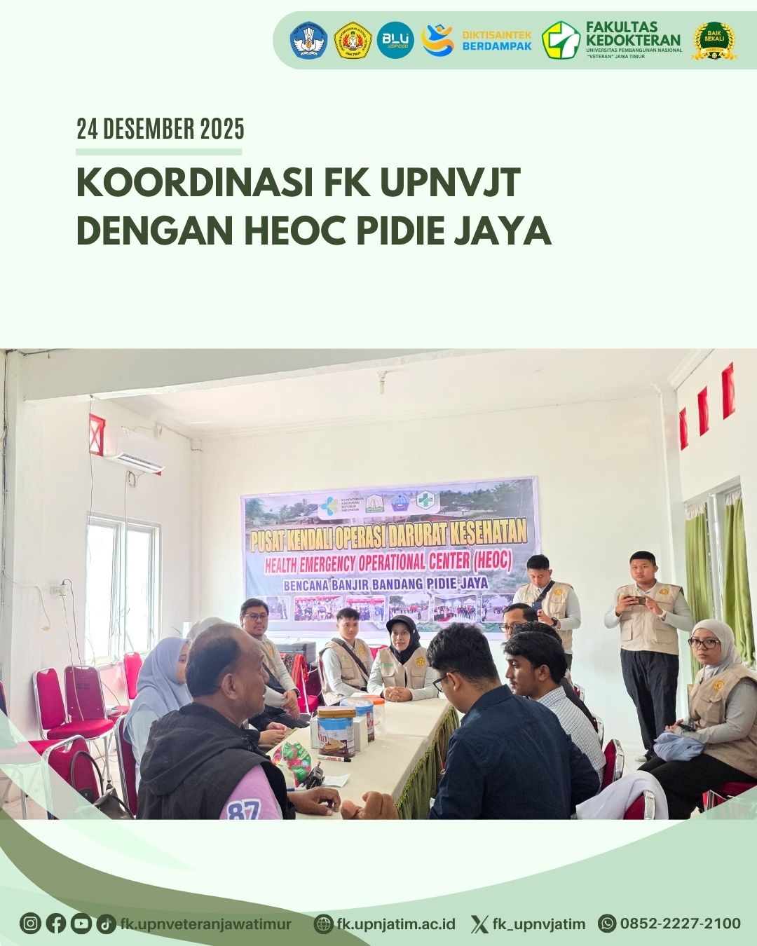 Aceh, 23 Desember 2025 — Tim Program Pengabdian Kepada Masyarakat Tanggap Darurat Bencana Aceh Fakultas Kedokteran Universitas Pembangunan Nasional (UPN) “Veteran” Jawa Timur melakukan koordinasi dengan Perguruan Tinggi posko yaitu Fakultas Kedokteran Universitas Syah Kuala...Read More