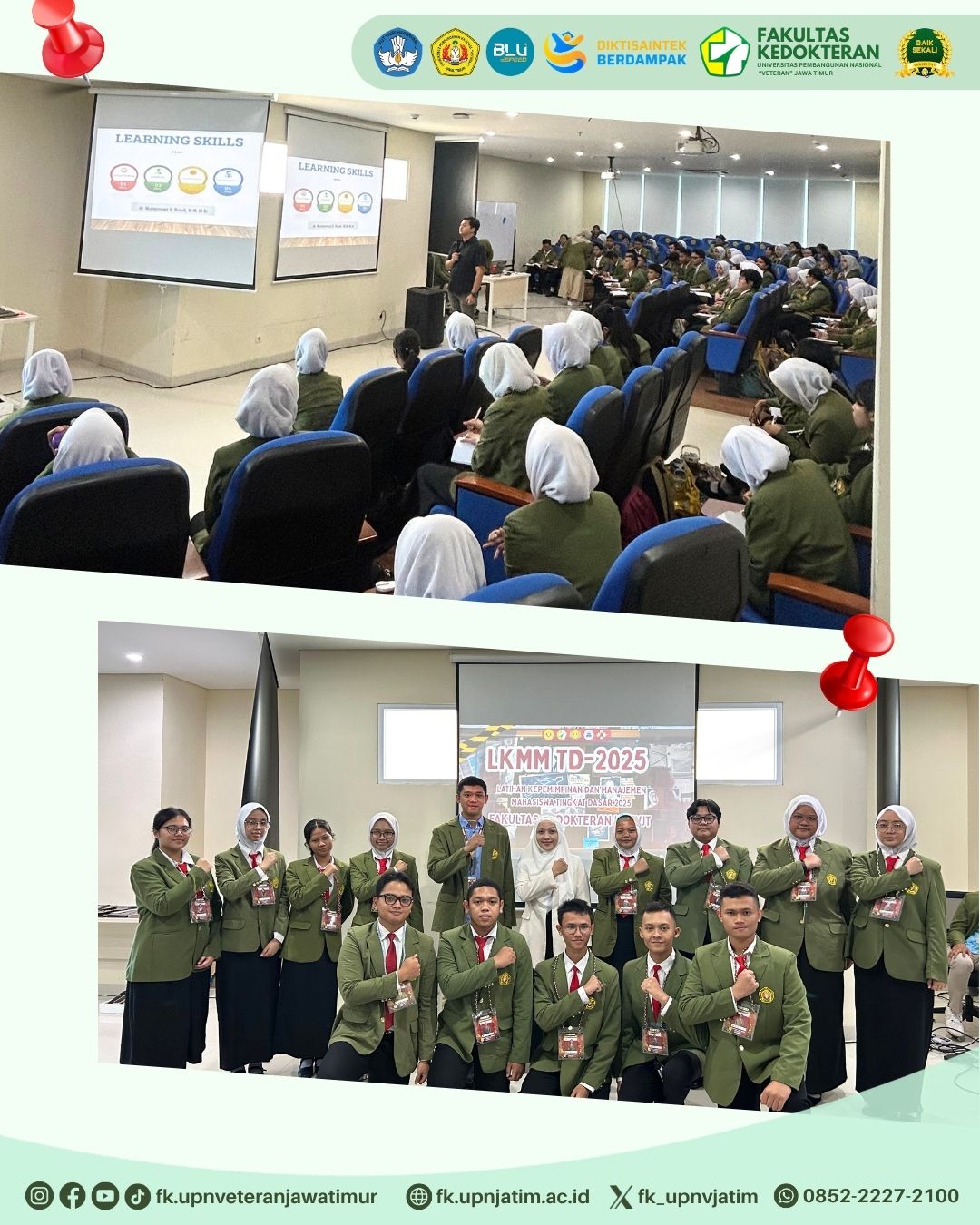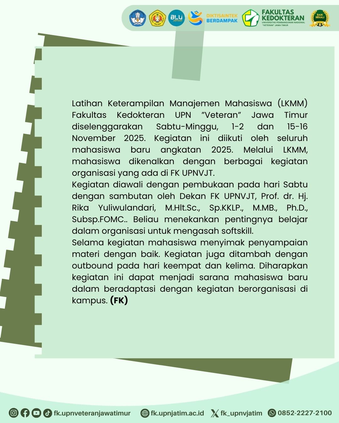 Latihan Keterampilan Manajemen Mahasiswa (LKMM) Fakultas Kedokteran UPN ”Veteran” Jawa Timur diselenggarakan Sabtu-Minggu, 1-2 dan 15-16 November 2025. Kegiatan ini diikuti oleh seluruh mahasiswa baru angkatan 2025. Melalui LKMM, mahasiswa dikenalkan dengan berbagai kegiatan organisasi yang ada di FK UPNVJT.