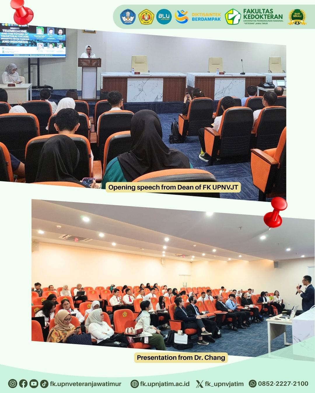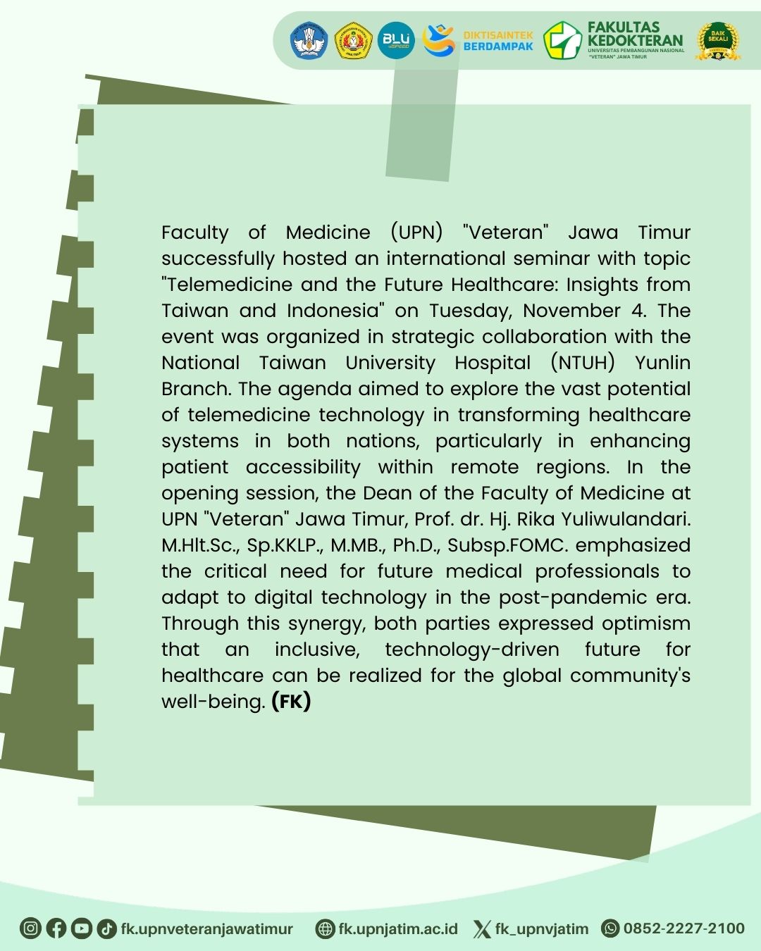 Faculty of Medicine (UPN) “Veteran” Jawa Timur successfully hosted an international seminar with topic “Telemedicine and the Future Healthcare: Insights from Taiwan and Indonesia” on Tuesday, November 4. The event was organized in strategic collaboration with the National Taiwan University Hospital (NTUH) Yunlin Branch. The agenda aimed to explore the vast potential of telemedicine technology in transforming healthcare systems in both nations, particularly in enhancing patient accessibility within remote regions.